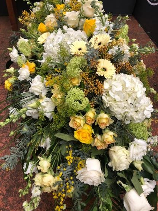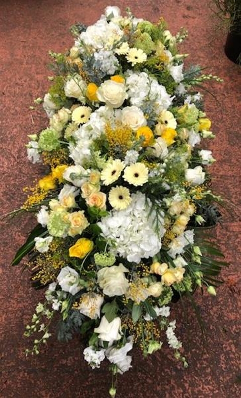A beautiful double ended spray in buttery cream and white tones with luscious foliage. The flowers are more grouped in style so it gives a slightly modern style.