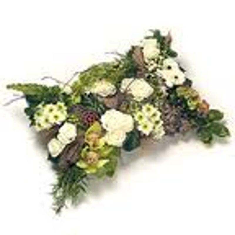 This pillow-shaped design has a woodland theme. We will use a mix of beautiful flowers and interesting foliage to create this special tribute. This is available in a choice of colours below, please select.