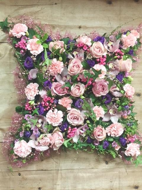 A beautiful cushion tribute of mixed flowers in pretty pinks and purples and lovely foliage.