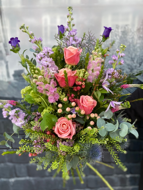 Using the pretty combination of pinks and purples, these beautiful flowers are arranged simply in a natural tied style.