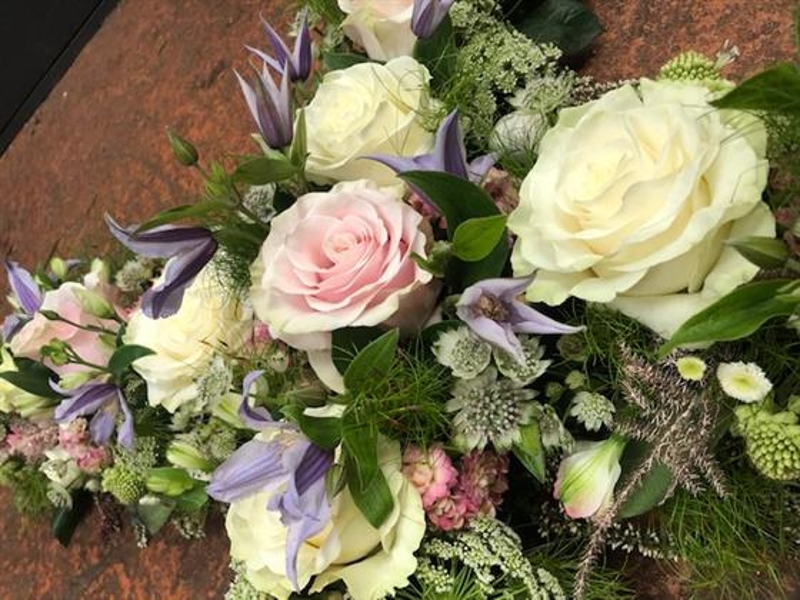 Beautiful selection of flowers, shown here in shades of pinks and lush green foliage.