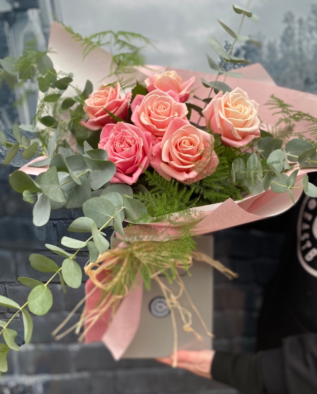 Six Long stem pink roses pink roses nestled into mixed foliages, beautifully gift wrapped in biodegradable and recyclable materials & delivered in water.