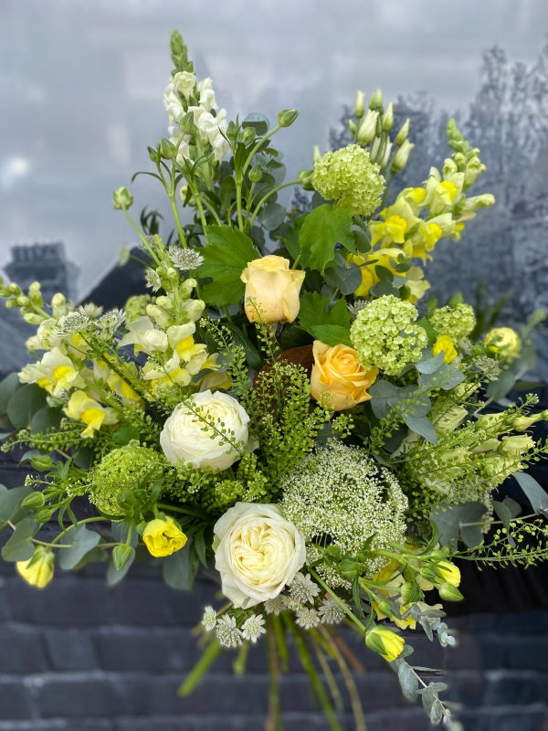 A combination of white, cream, green and yellow country garden style flowers tied in a loose and natural design.