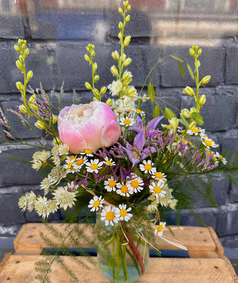 An eclectic collection of seasonal Country garden style flowers and colours loosely arranged in recycled Jam Jars, the ideal little arrangement to use as a table centre, suitable for any event.