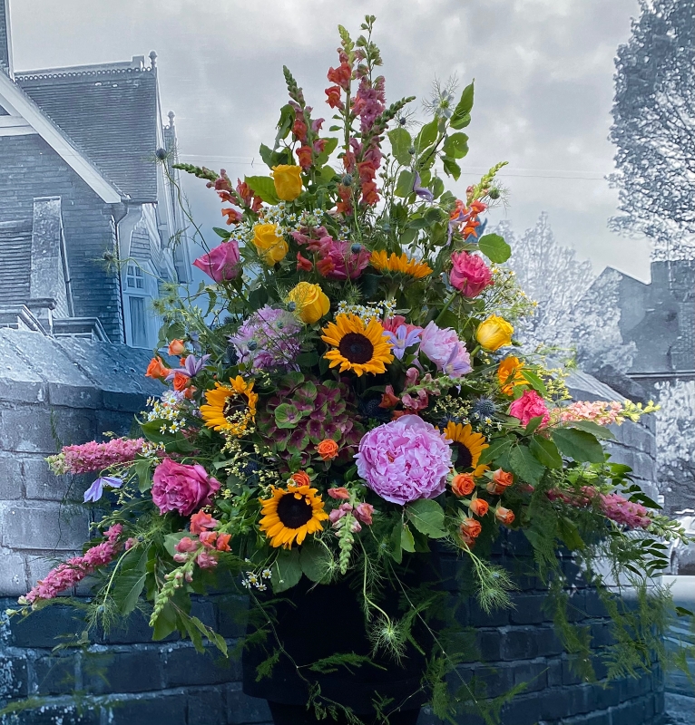 A front facing arrangement arranged in oasis using flowers and colours of the season, in usual country garden style.
