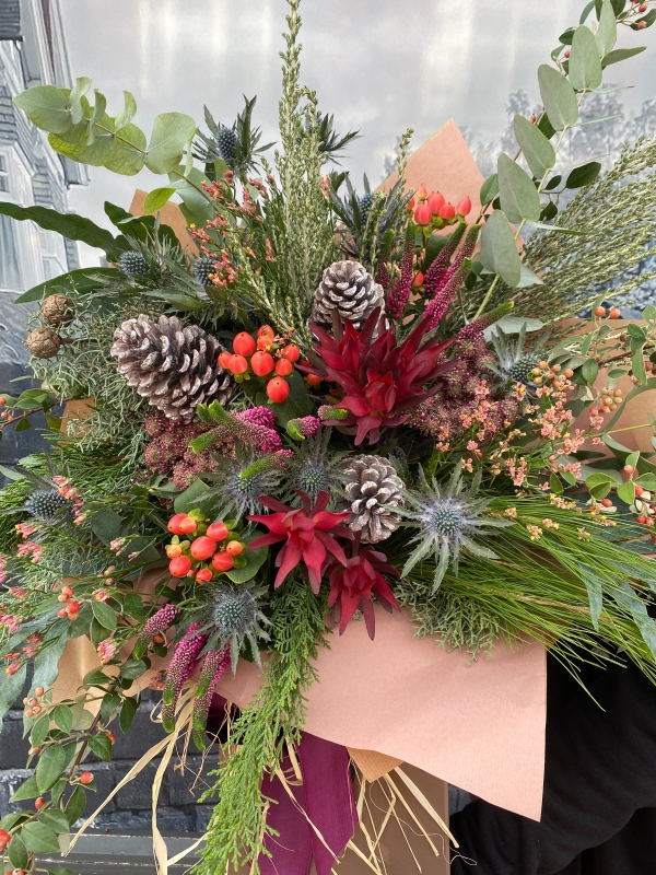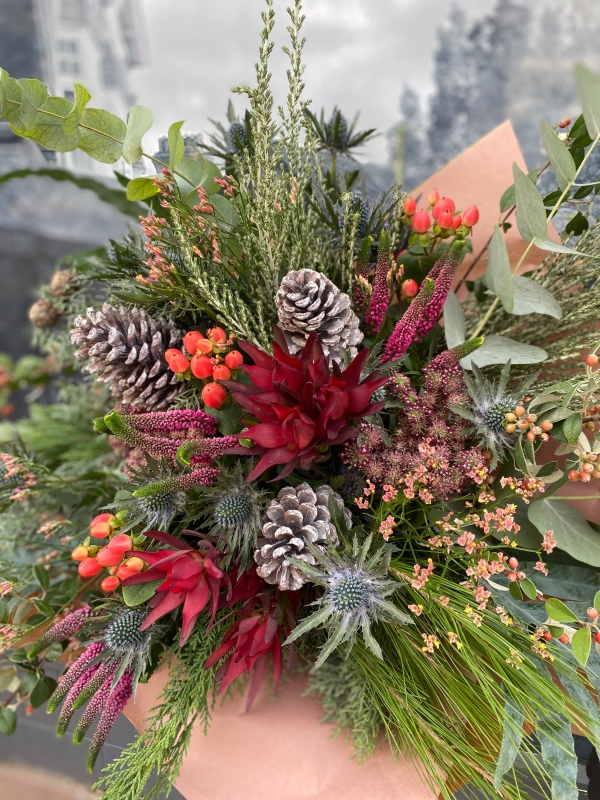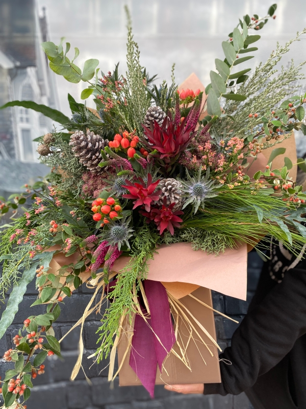 An electic mix of natural seasonal colours, flowers and foliages Hand Tied, Gift wrapped in biodegradable and recyclable materials. Comes delivered in water.