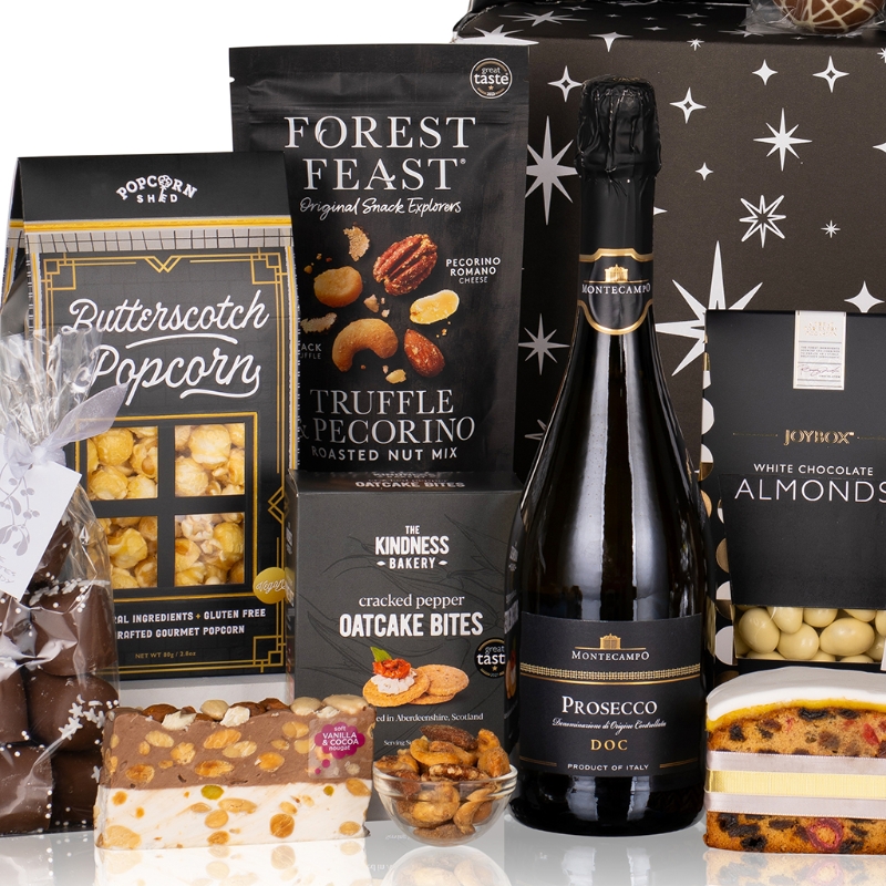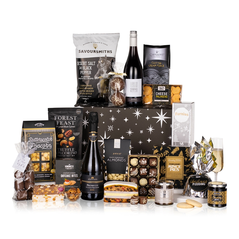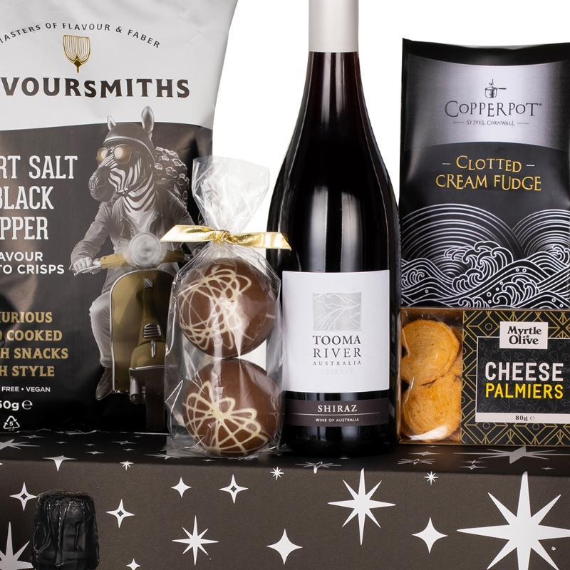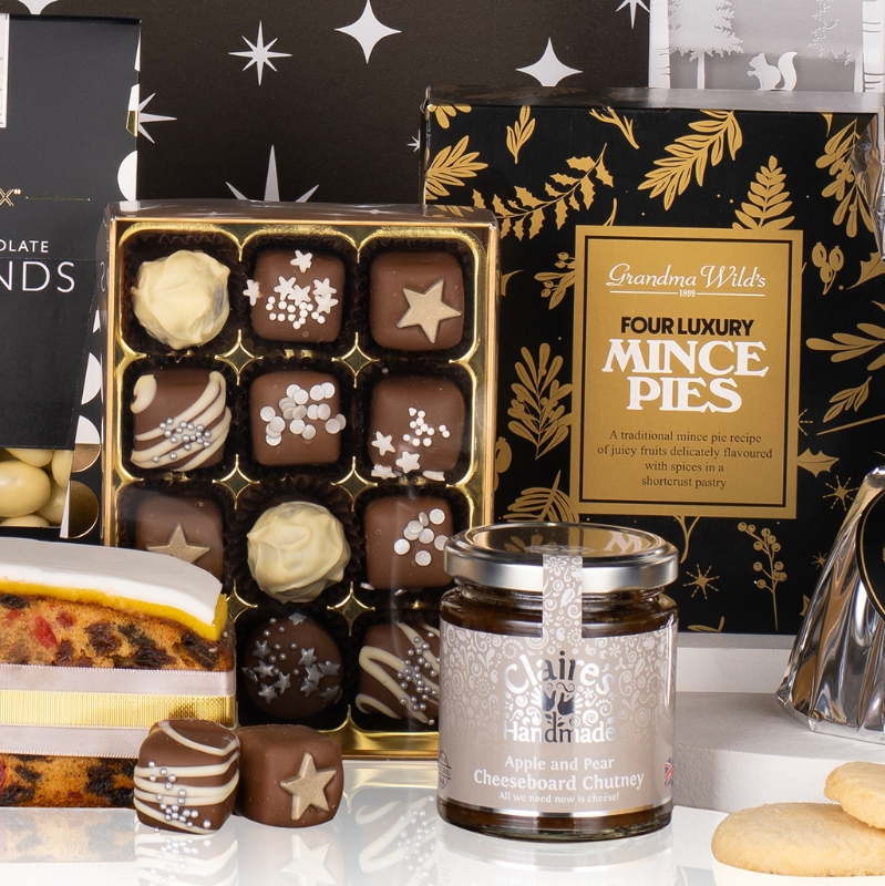 Begin your epicurean journey with the festive charm of Luxury Mince Pies, accompanied by the tantalizing allure of Myrtle & Olive Cheese Palmiers with a striking Black & Gold Label and Crunch & Crumble Shortbread. Delight in the decadent flavours of House of Fudge White Chocolate & Cranberry Fudge and Maxwell & Franks Chocolate Cake with Raspberry Sprinkles, while savouring the artisanal excellence of Orchard Preserves Strawberry Jam and Claire's Handmade Apple and Pear Cheeseboard Chutney.