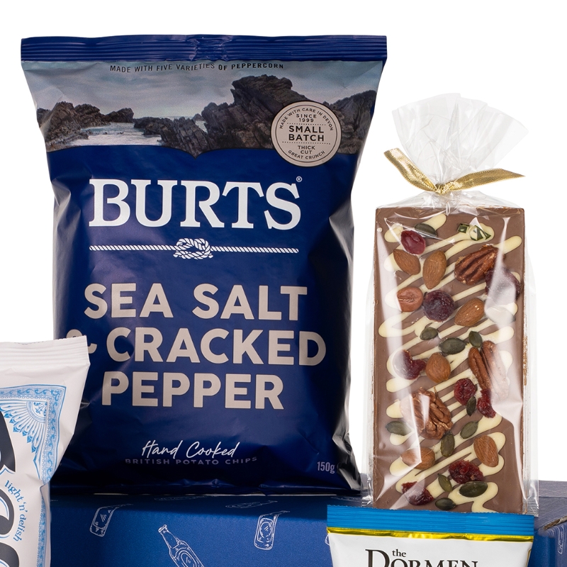 Snack smart with a moreish mix of savoury delights, starting with Burts British Hand Cooked Potato Chips in Sea Salt & Crushed Peppercorns and the satisfyingly crunchy Love Corn Sea Salt Crunchy Corn. Add in Howdah Himalayan Salt Poppadom Minis and The Dormen Salted Peanuts for that full-bodied flavour punch.