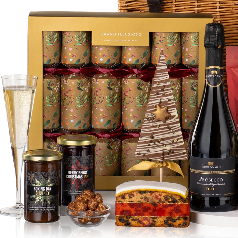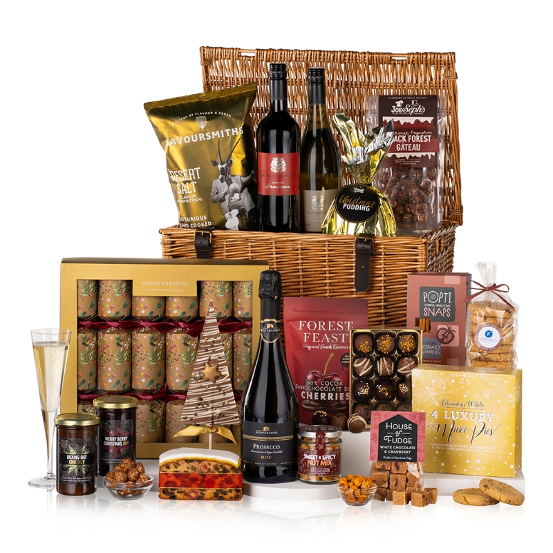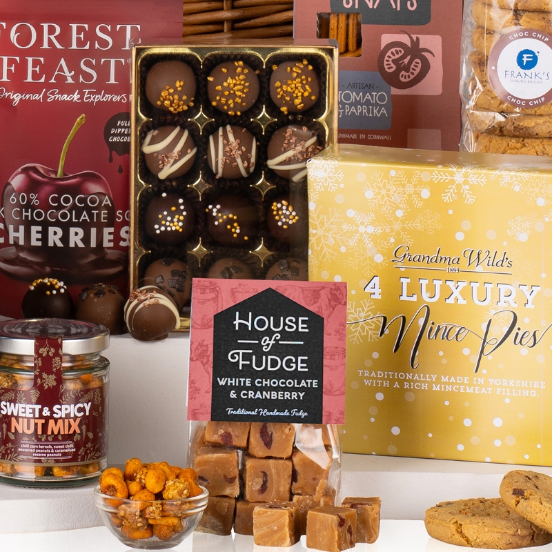 Begin your feast with Grandma Wild’s luxury Mince Pies and the indulgent Market Town Bakery Iced Rich Fruit Cake, perfect for sharing cherished moments. Elevate your savoury selection with Popti Cornish Bakehouse Tomato and Paprika Snaps and the crisp Savoursmiths Desert Salt Crisps.