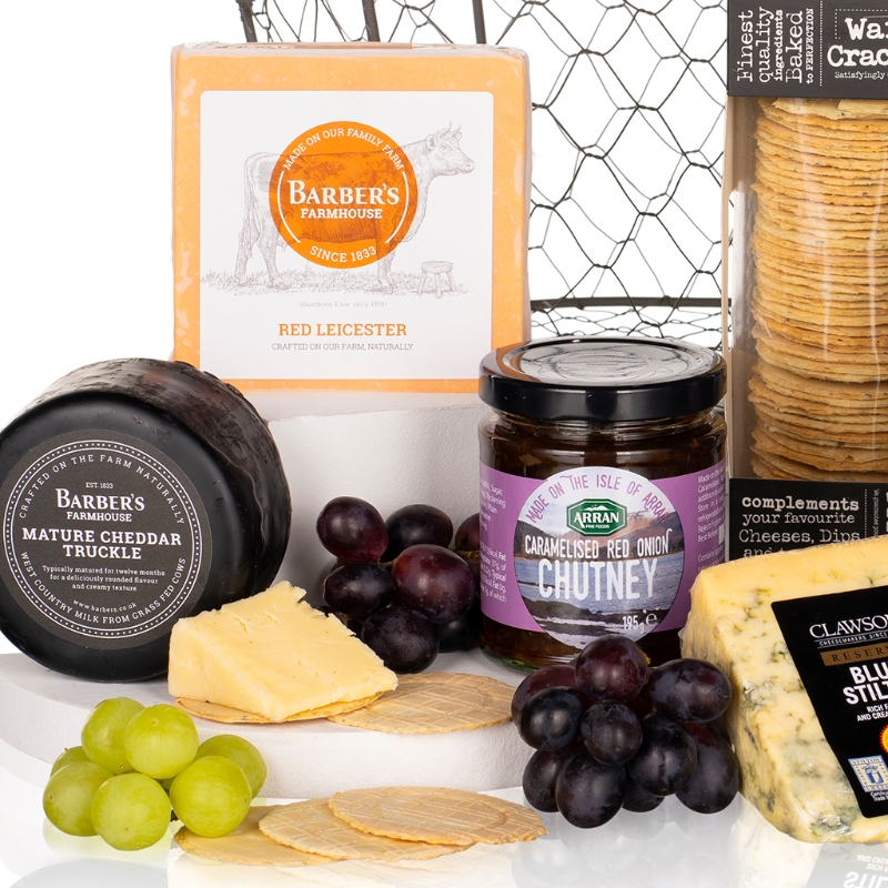 Enjoy three classic cheeses: Barber’s Farmhouse Mature Cheddar and Red Leicester, alongside the creamy depth of Long Clawson’s Blue Stilton. These British favourites are ready to be paired with a generous helping of Arran’s caramelised red onion chutney for a sweet and savoury balance.