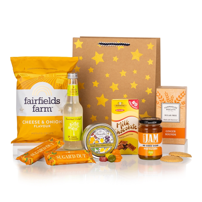 Delight health-conscious recipients with the Lovingly Low Sugar Hamper—a sophisticated collection of guilt-free treats that proves mindful indulgence can be utterly delicious. Presented in a chic gold-stars paper bag, this thoughtful assortment is ideal for friends, clients, or loved ones watching their sugar intake without sacrificing flavour.