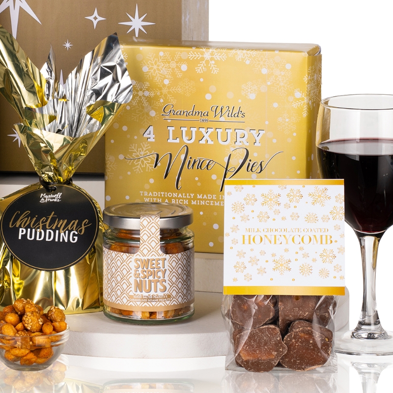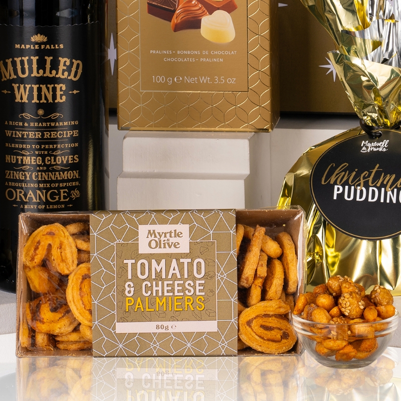Crunch & Crumble’s chocolate chip biscuits and Maxwell & Franks’ traditional Christmas pudding bring comfort and nostalgia, while Myrtle & Olive’s tomato & cheese palmiers, Cambrook’s spiced nut mix, and Savoursmiths’ desert salt crisps add a savoury touch to this generous gift.