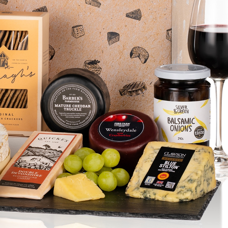 Delight in the rich, mature flavours of Barber’s Farmhouse Cheddar and the festive sweetness of Ford Farm Wensleydale with Cranberries, joined by the bold punch of Long Clawson Blue Stilton and creamy Gillot Camembert. For something truly special, Quicke’s Double Devonshire Clothbound Cheese rounds off this cheese board selection with a refined, handcrafted depth.