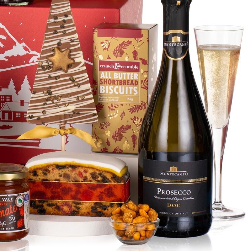 Raise a toast with the sparkling Montecampo Prosecco DOC or unwind with the velvety smooth Kintu Merlot—a duo that sets the tone for celebration. Dive into artisan delights including Butlers Caramel & Truffle Chocolates, House of Fudge Dark Chocolate & Clementine Fudge, and the decadent Stas Milk Chocolate Tree Slab Lolly.