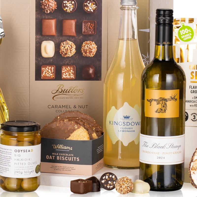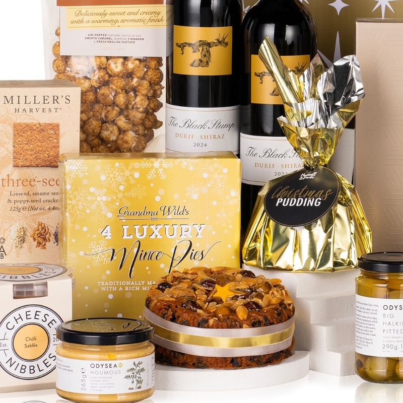 This indulgent selection starts with rich, buttery Maxwell & Franks Cherry & Almond Cake and their iconic Christmas Pudding. Raise a toast with Montecampo Prosecco DOC or enjoy the bold character of The Black Stump Chardonnay Pinot Grigio and Durif Shiraz, beautifully paired with a host of sweet and savoury delights.